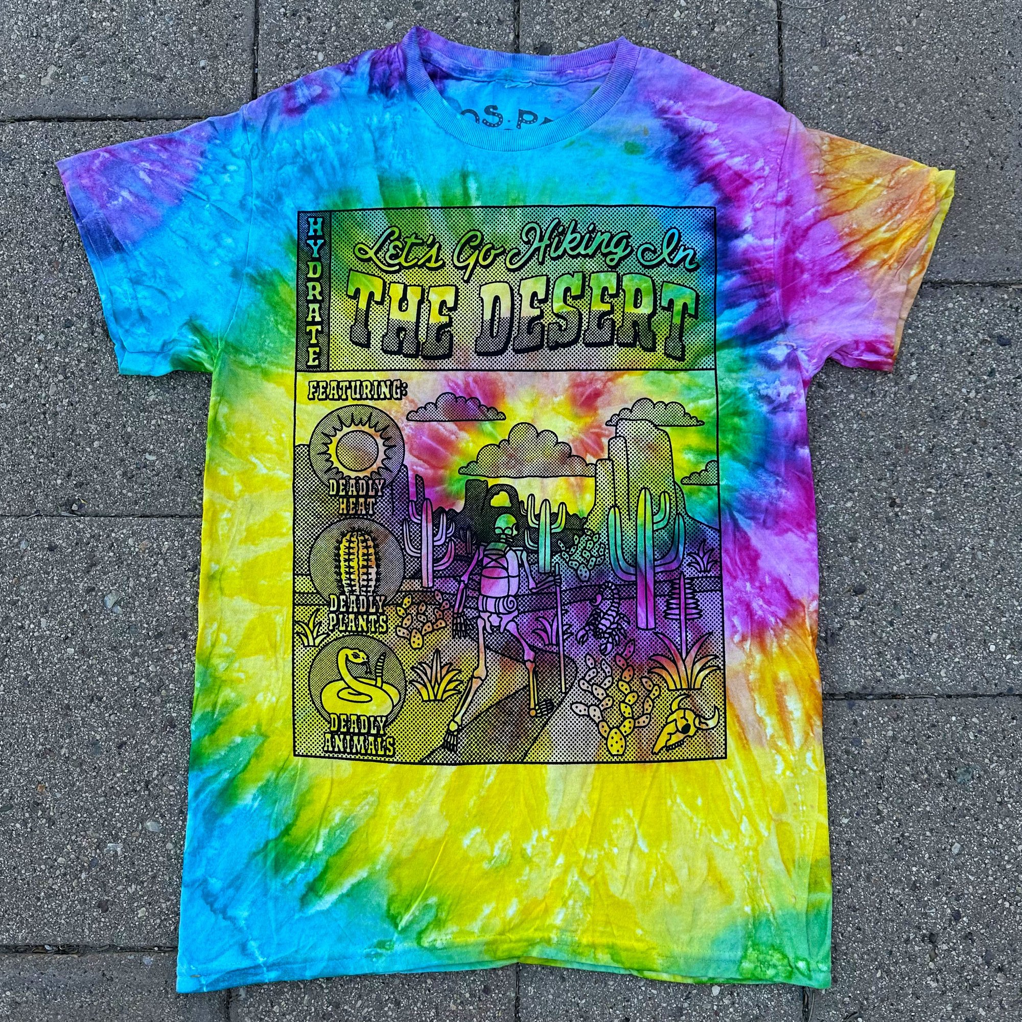 Printed with water-based ink on tie-dye Colortone shirts in Tucson, AZ.