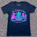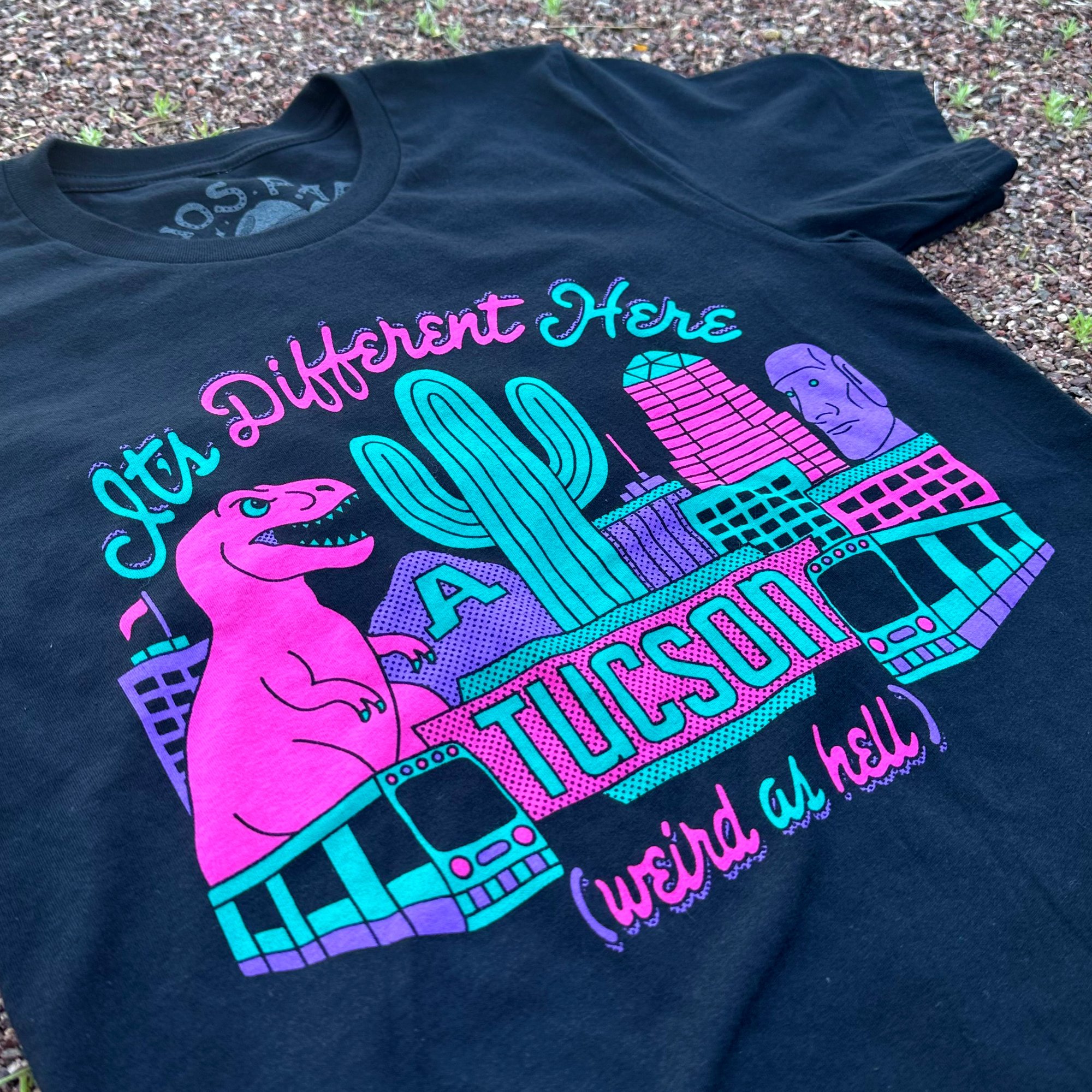 Screen printed with water-based ink on black Bella+Canvas shirts in Tucson, AZ. 100% cotton, unisex fit.
